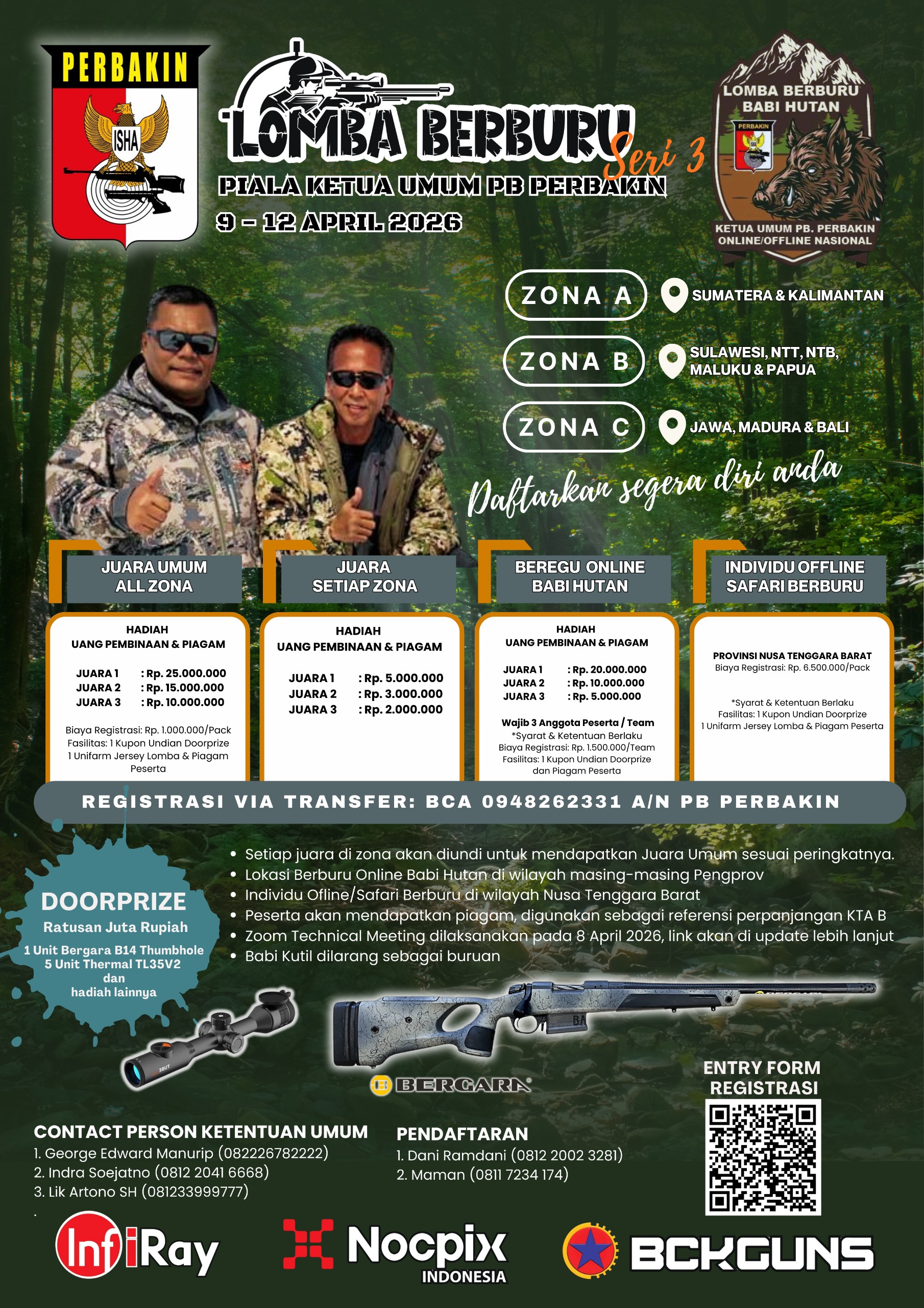 PB PERBAKIN kembali menyelenggarakan Lomba Berburu Babi Hutan Seri 3 memperebutkan Piala Ketua Umum yang akan berlangsung pada 9 hingga 12 April 2026. Kompetisi ini dibagi menjadi tiga zona wilayah, mencakup seluruh Indonesia mulai dari Sumatera, Kalimantan, Sulawesi, NTT, NTB, Maluku, Papua, hingga Jawa, Madura, dan Bali. Terdapat beberapa kategori perlombaan, di antaranya Juara Umum All Zona, Juara Setiap Zona, Beregu Online Babi Hutan, serta kategori Individu Offline Safari Berburu yang khusus dilaksanakan di wilayah Nusa Tenggara Barat.