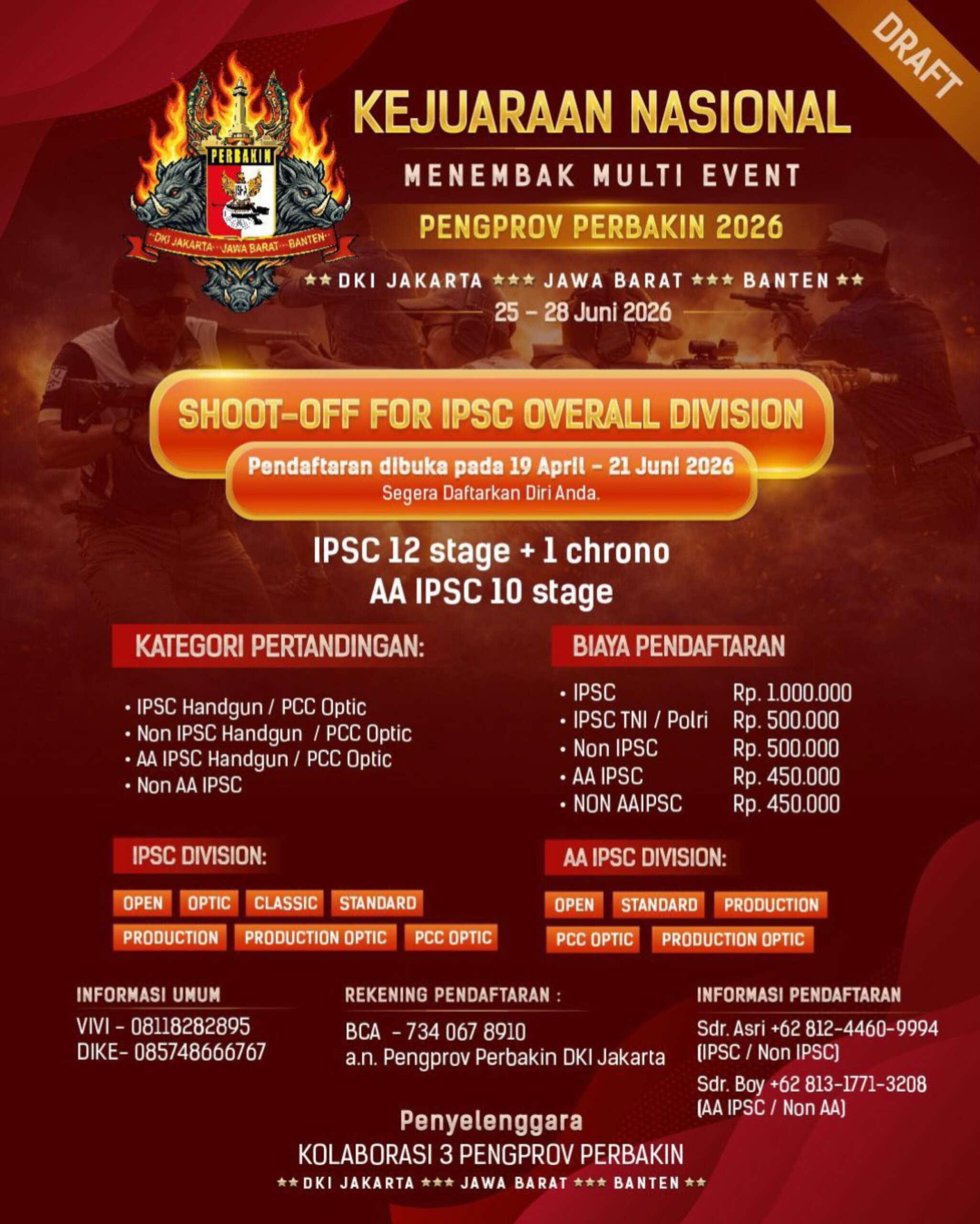 Bagi para atlet dan penghobi olahraga menembak di tanah air, Kolaborasi apik antara tiga Pengurus Provinsi (PENGPROV) PERBAKIN – DKI Jakarta, Jawa Barat, dan Banten kembali menghadirkan ajang bergengsi: Kejuaraan Nasional Menembak Multi Event 2026.
